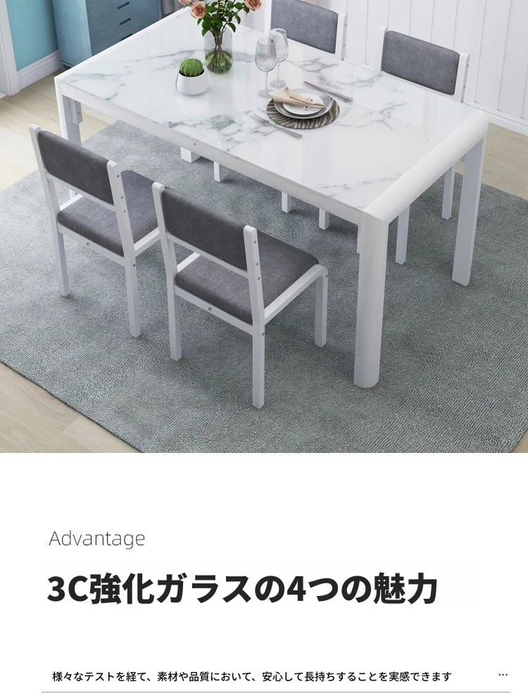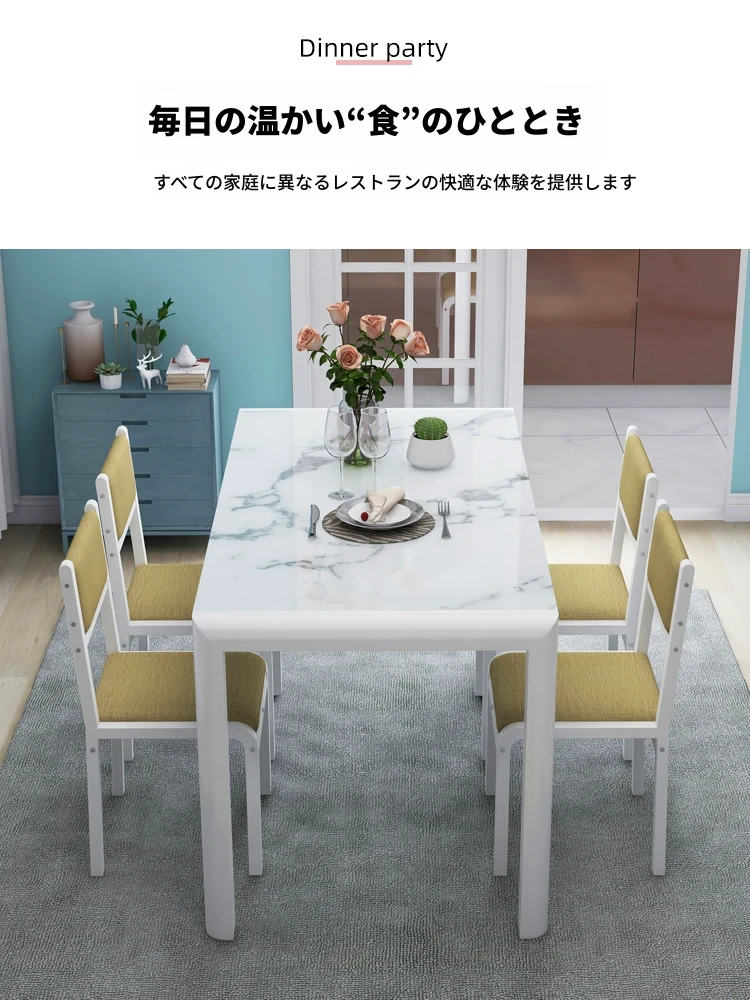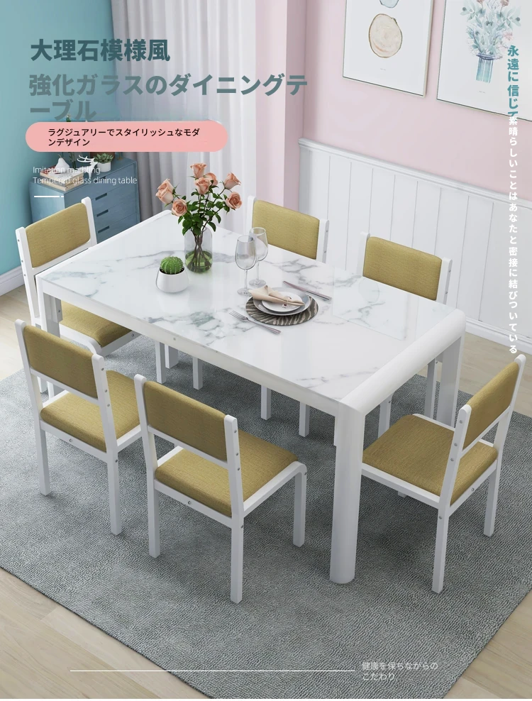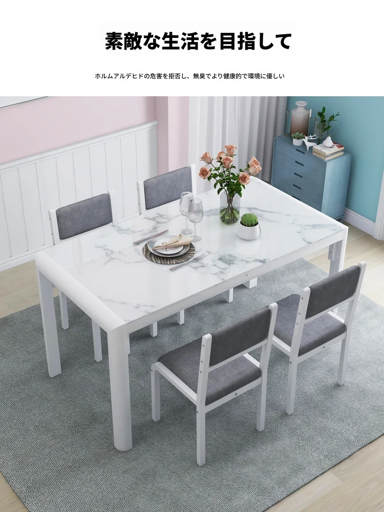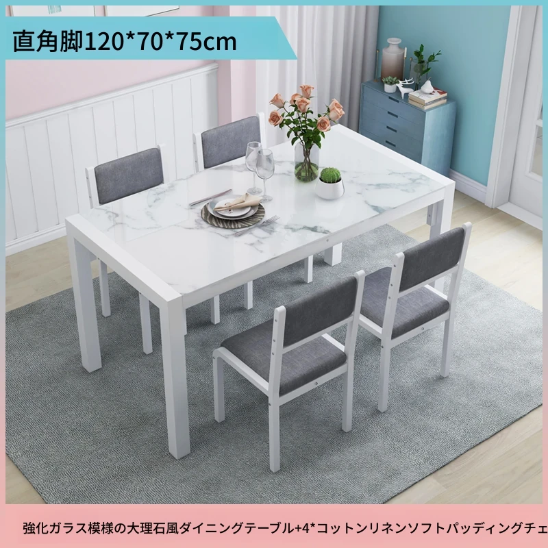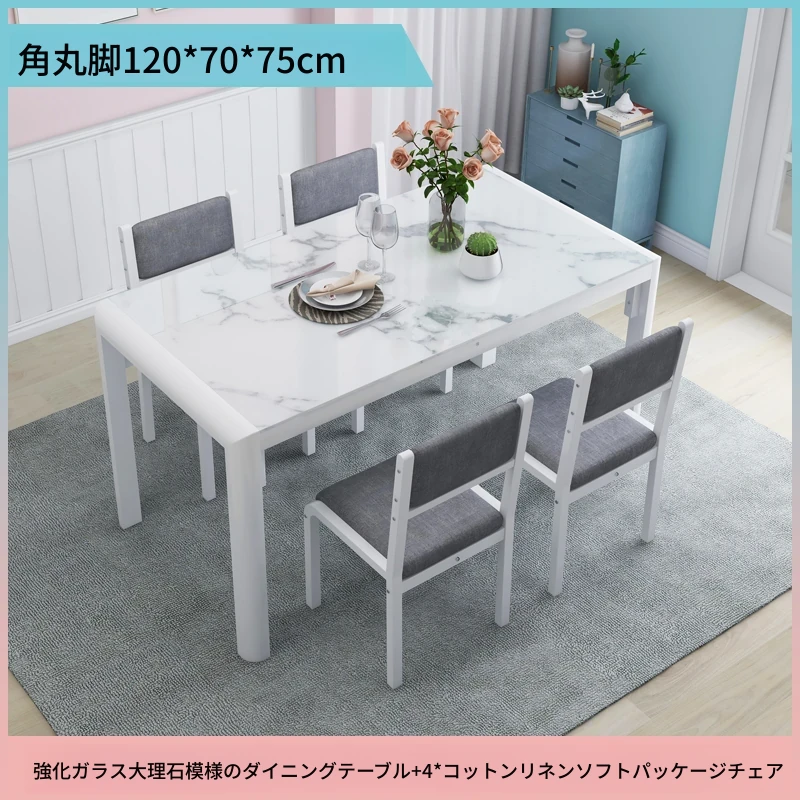 120*70 直角レッグ 大理石模様 + 4* コットンリネン ソフトパックチェア