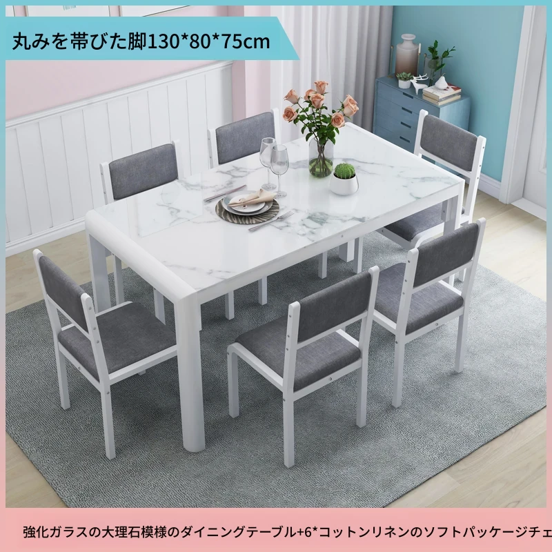 130*80 ラウンドレッグ 大理石模様 + 6* コットンリネン ソフトパックチェア
