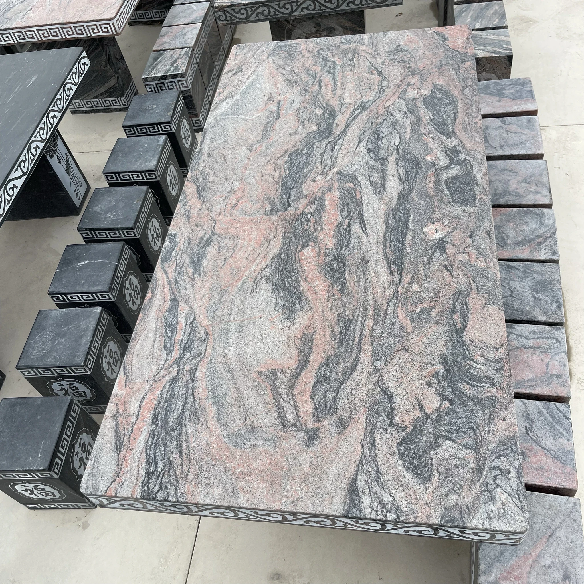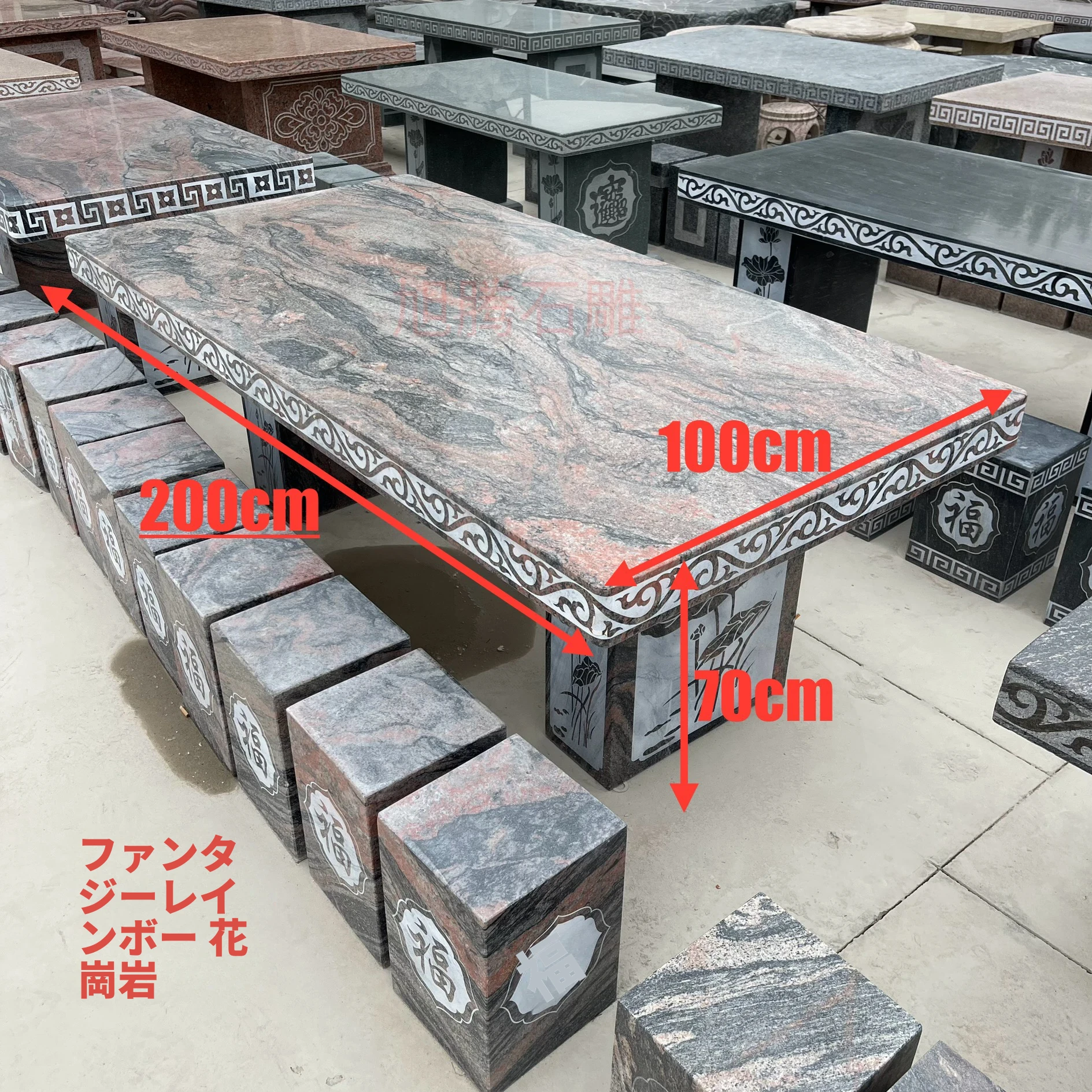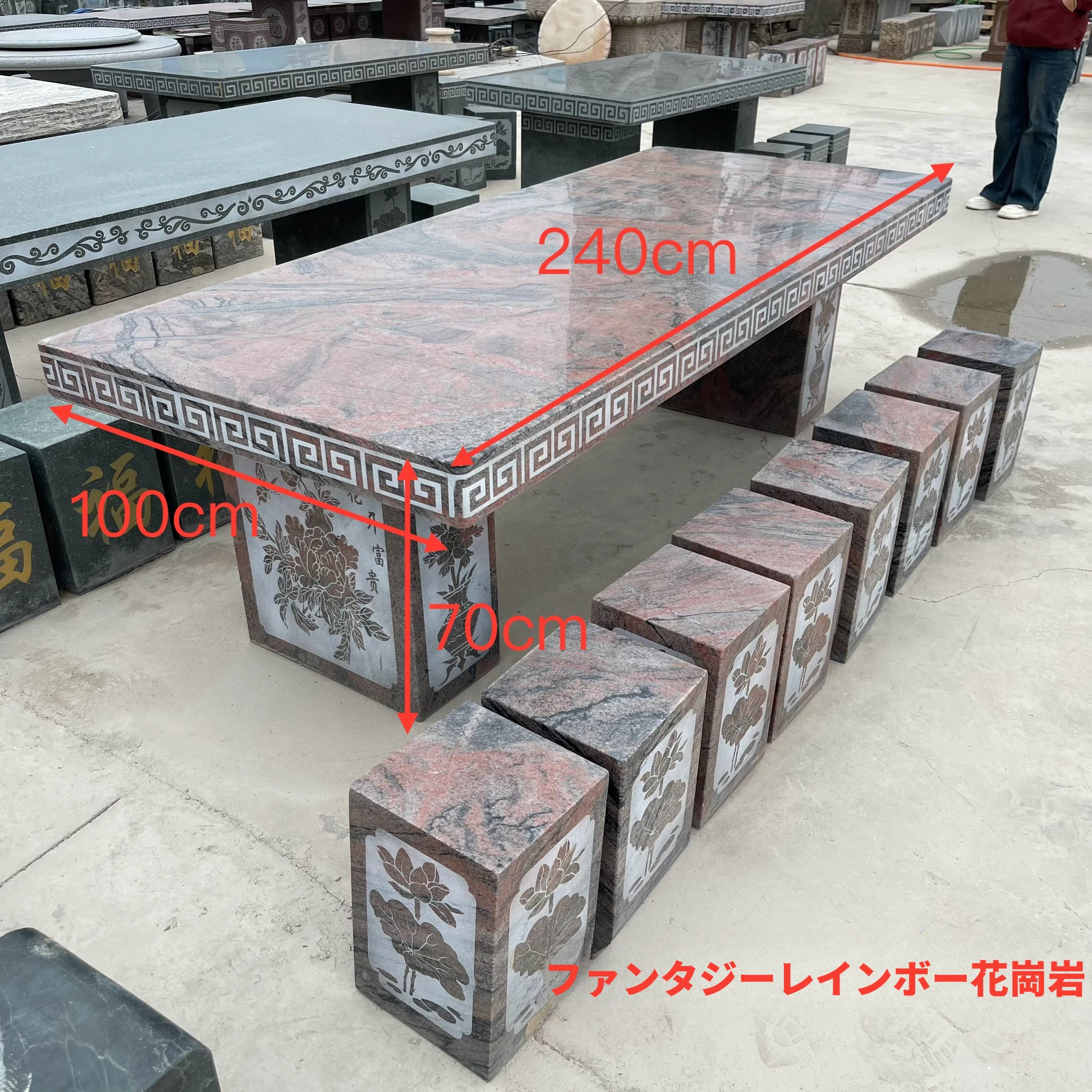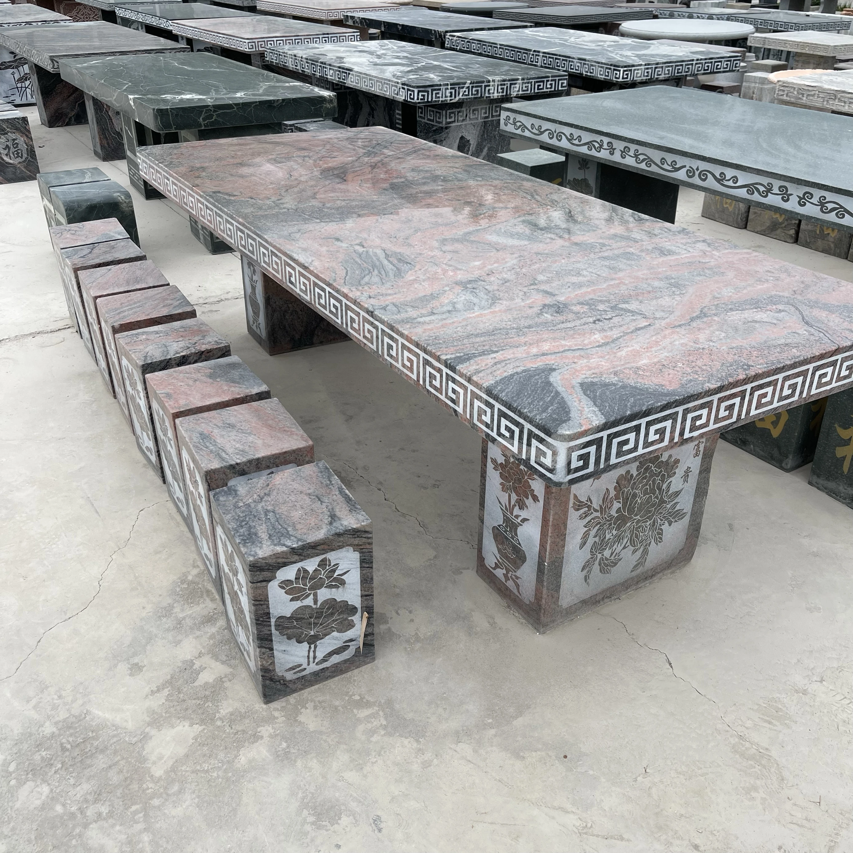 天然石材製の長方形テーブル&チェアセット - おしゃれなアウトドア用、別荘や庭に最適!耐久性抜群で、自然な風合いを楽しめる石のテーブルは、あなたの空間を格上げします。