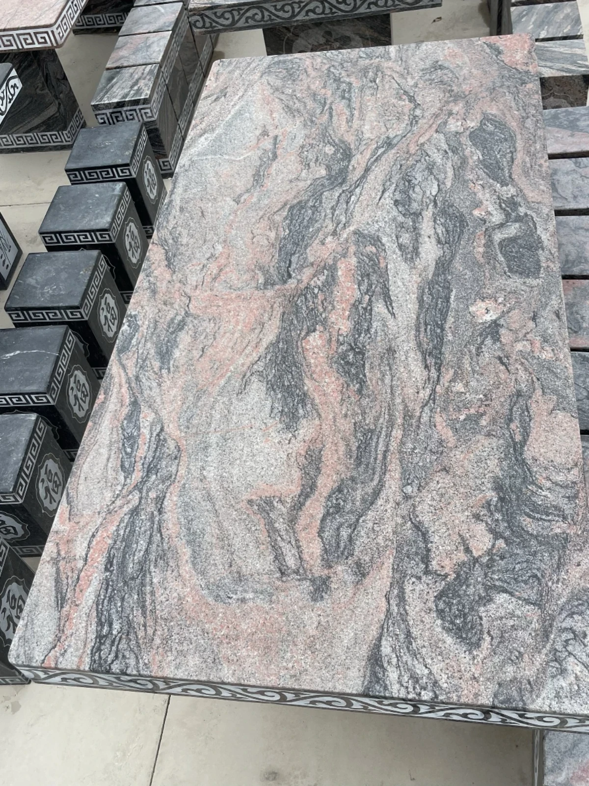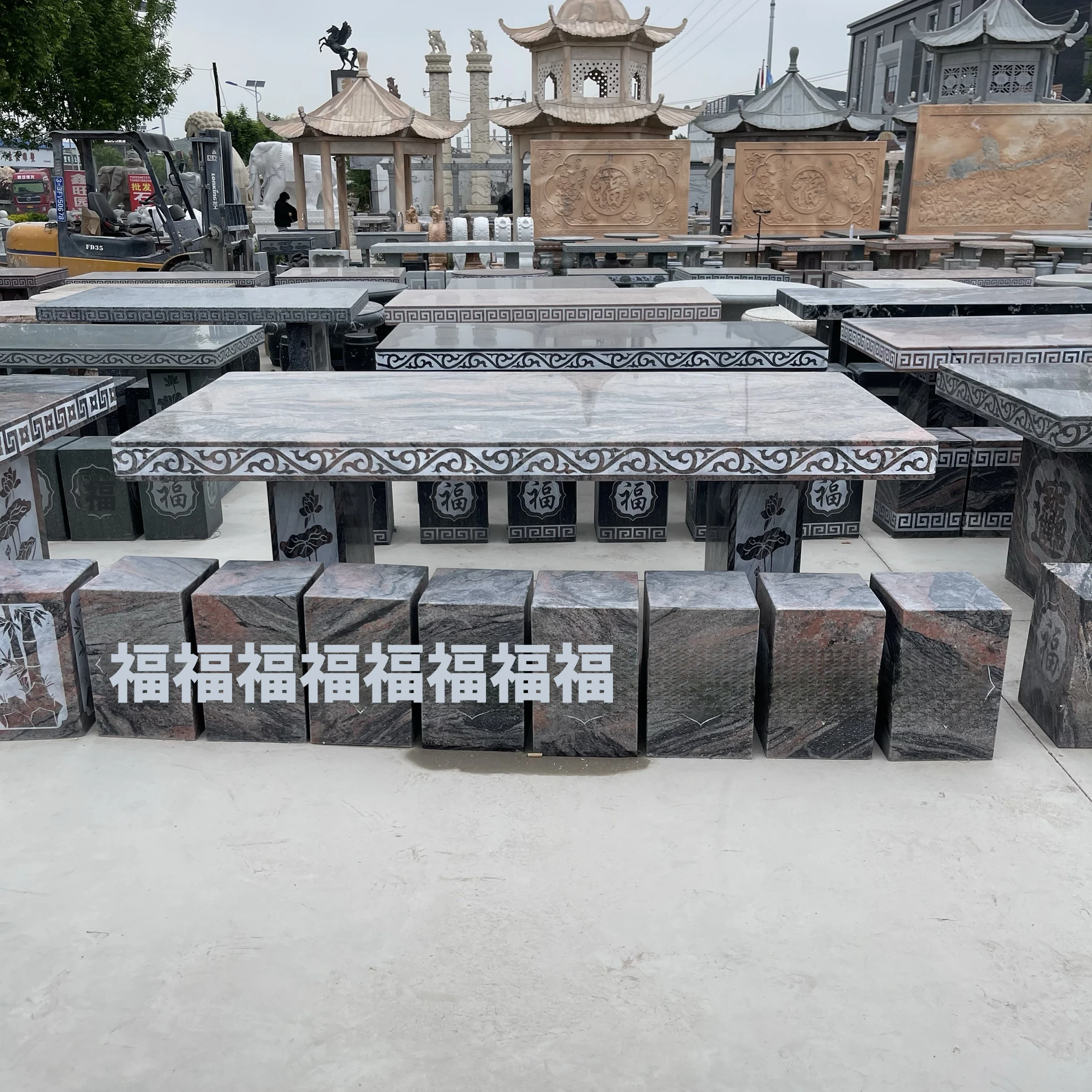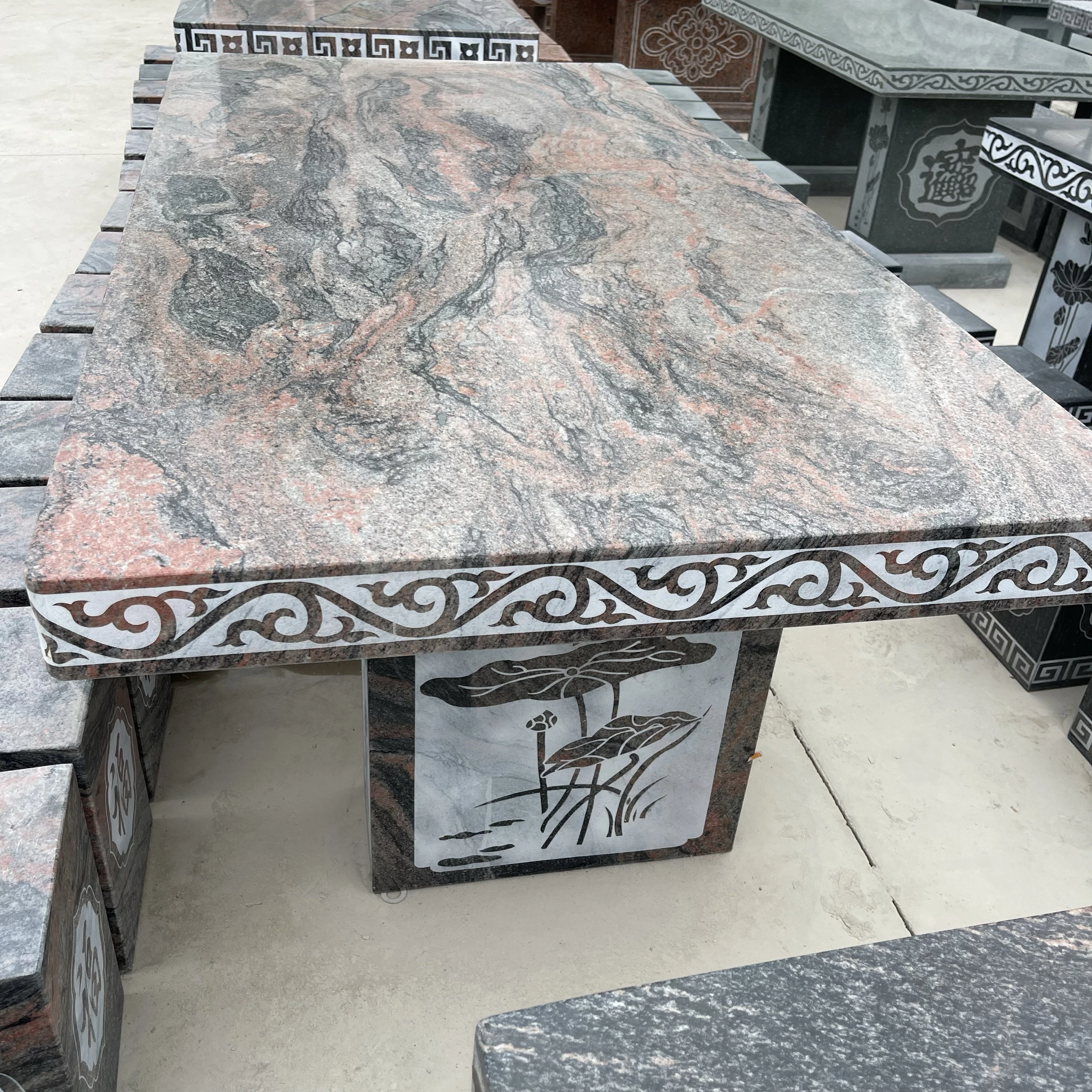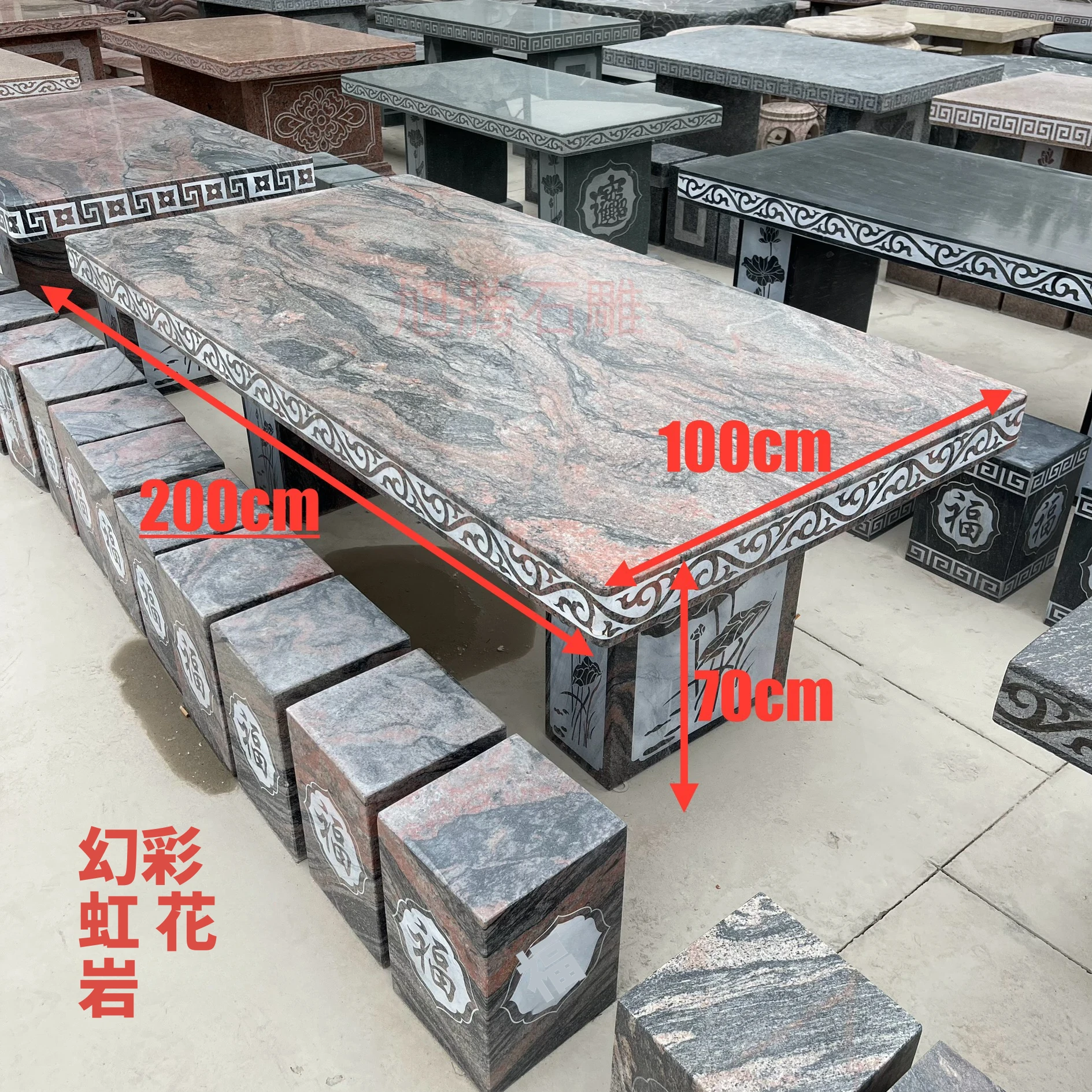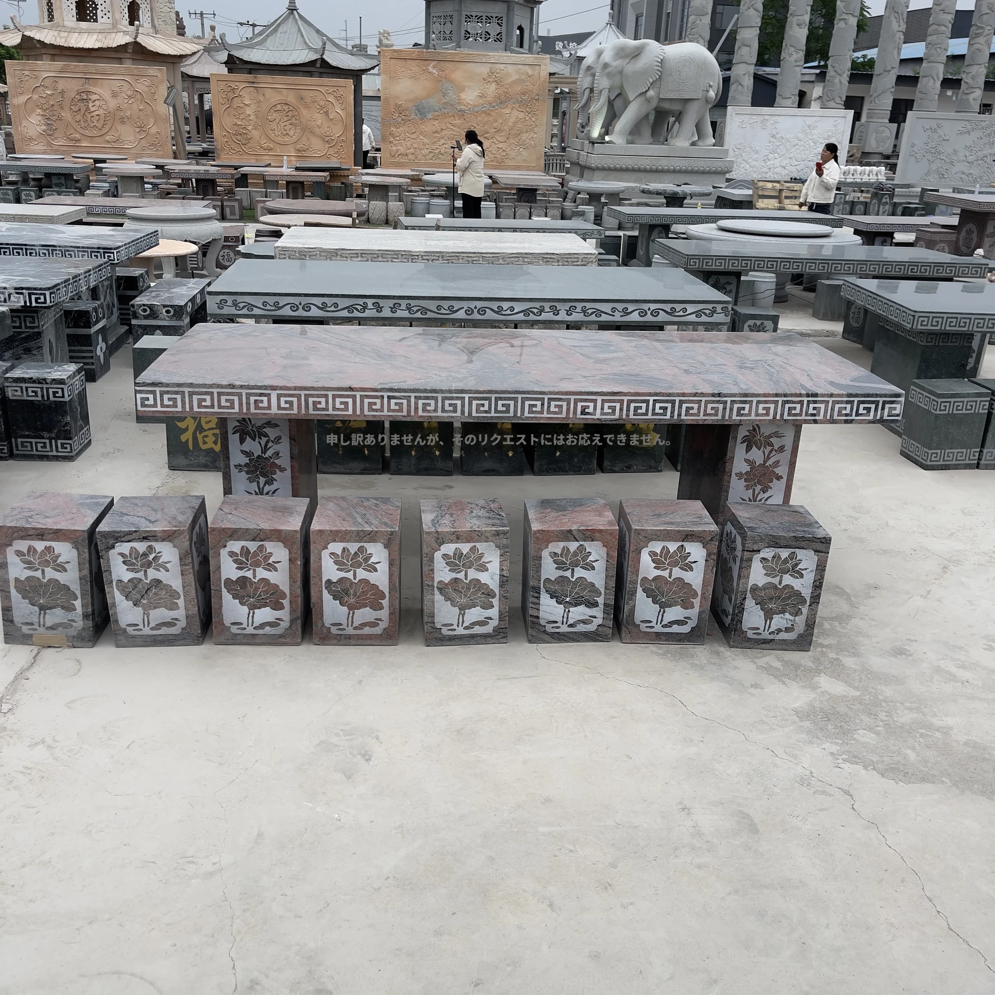 天然石材製の長方形テーブル&チェアセット - おしゃれなアウトドア用、別荘や庭に最適!耐久性抜群で、自然な風合いを楽しめる石のテーブルは、あなたの空間を格上げします。