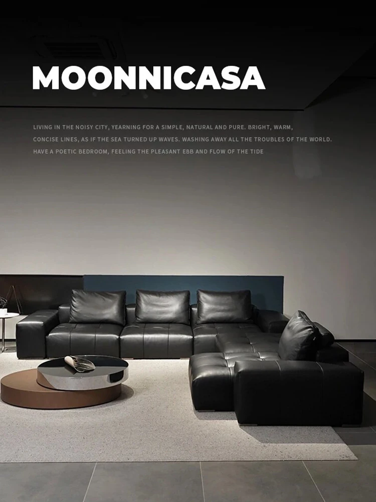 イタリアンミニマルデザインの本革ピクセルソファー - コンパクトなリビングにぴったりなヴィンテージブラックのモジュラーソファセット。スタイリッシュな空間を演出し、快適なひとときをお届けします!