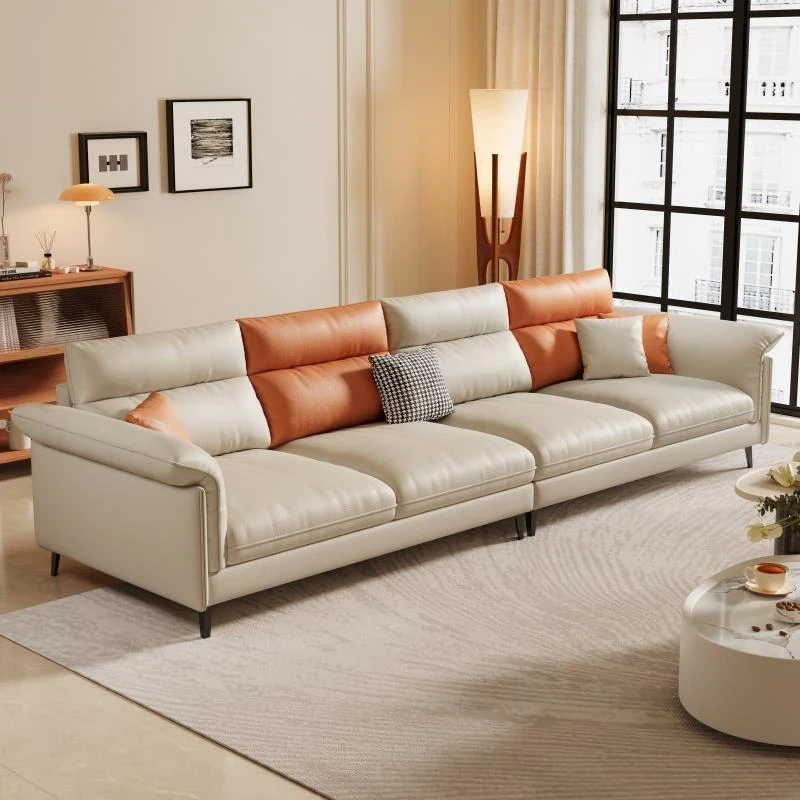 新作イタリアンミニマリスト本革ソファー、リビングに最適!クリーミーカラーでおしゃれな三〜四人用、フットスツール付きの組み合わせ。コンパクトサイズでお部屋を美しく演出します!