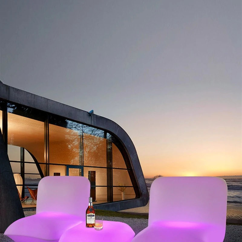 LED光るリラックスチェア!人気のビーチスタイル、プラスチック製のスタッキングソファ。立方体デザインで、バーやティータイムにぴったりの光るテーブル。おしゃれな空間を演出しよう!