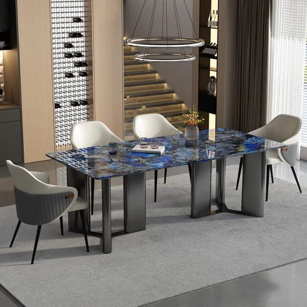 ラグジュアリーなブルージェイド大理石の長方形ダイニングテーブルセット - 6脚の椅子付き!洗練された石のテクスチャーで、あなたの食卓を華やかに彩ります。家庭用に最適な高級感溢れるデザイン。