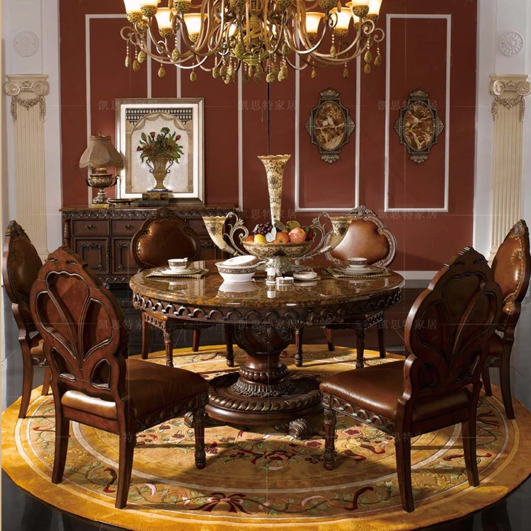 アメリカンスタイルの無垢材ダイニングテーブルと本革チェアセット 欧風ラウンドテーブル 高級大理石ダイニングテーブル 本革チェア付きで、洗練された食事空間を演出します!