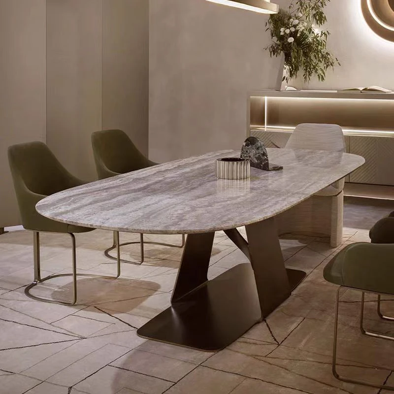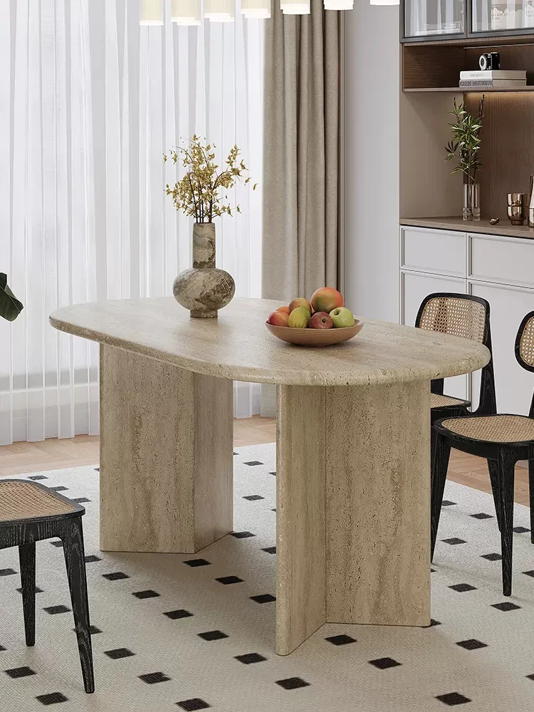 侘寂風の天然洞石オーバルダイニングテーブル - 中古風のミニマリストデザインで、家庭にぴったりのリラックスした雰囲気を演出。長くてスタイリッシュな形状で、特別な食事のひとときを提供します。